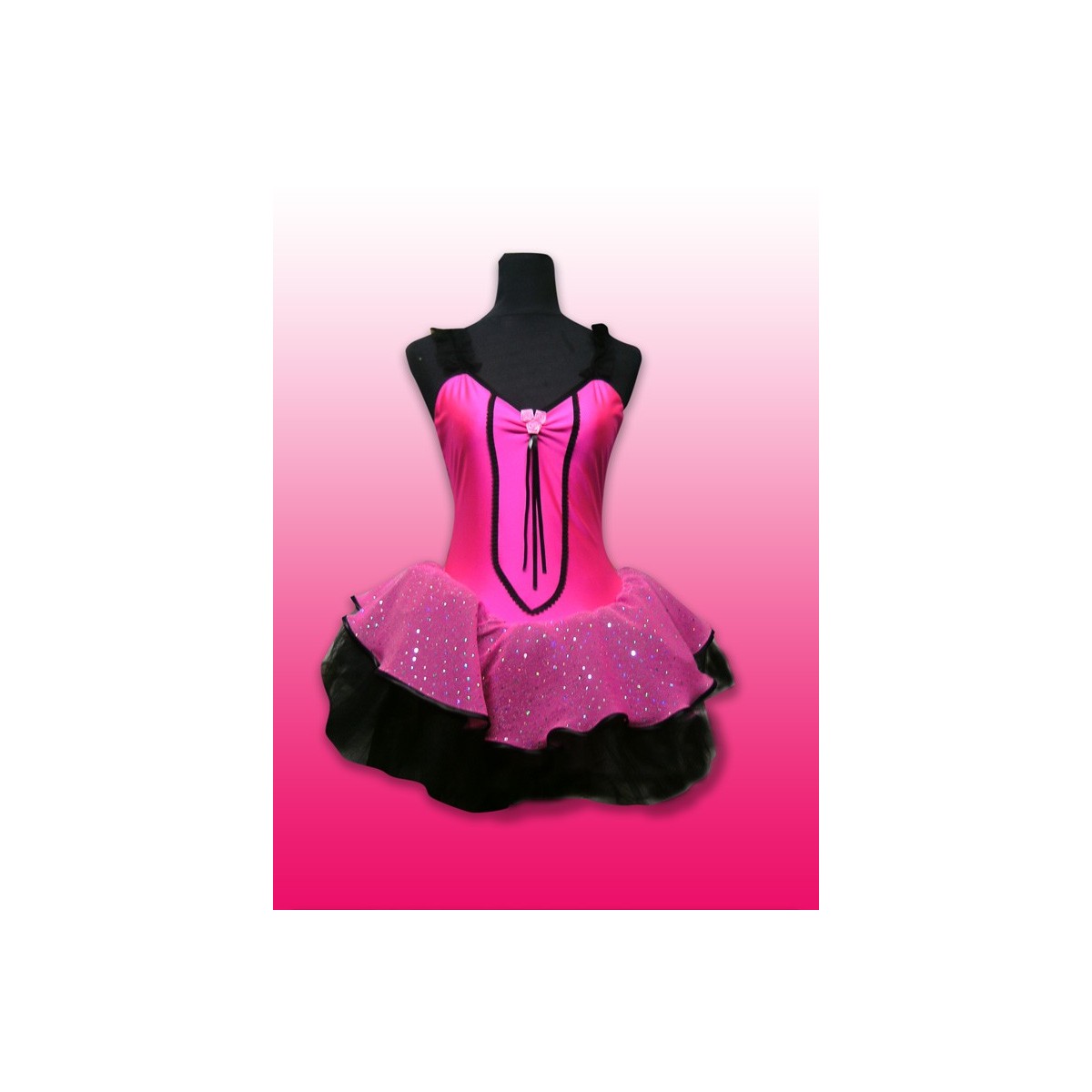 Tutu by performance in eight layers of black tulle. The body is made of lycra pink rouched straps in black sparkle.