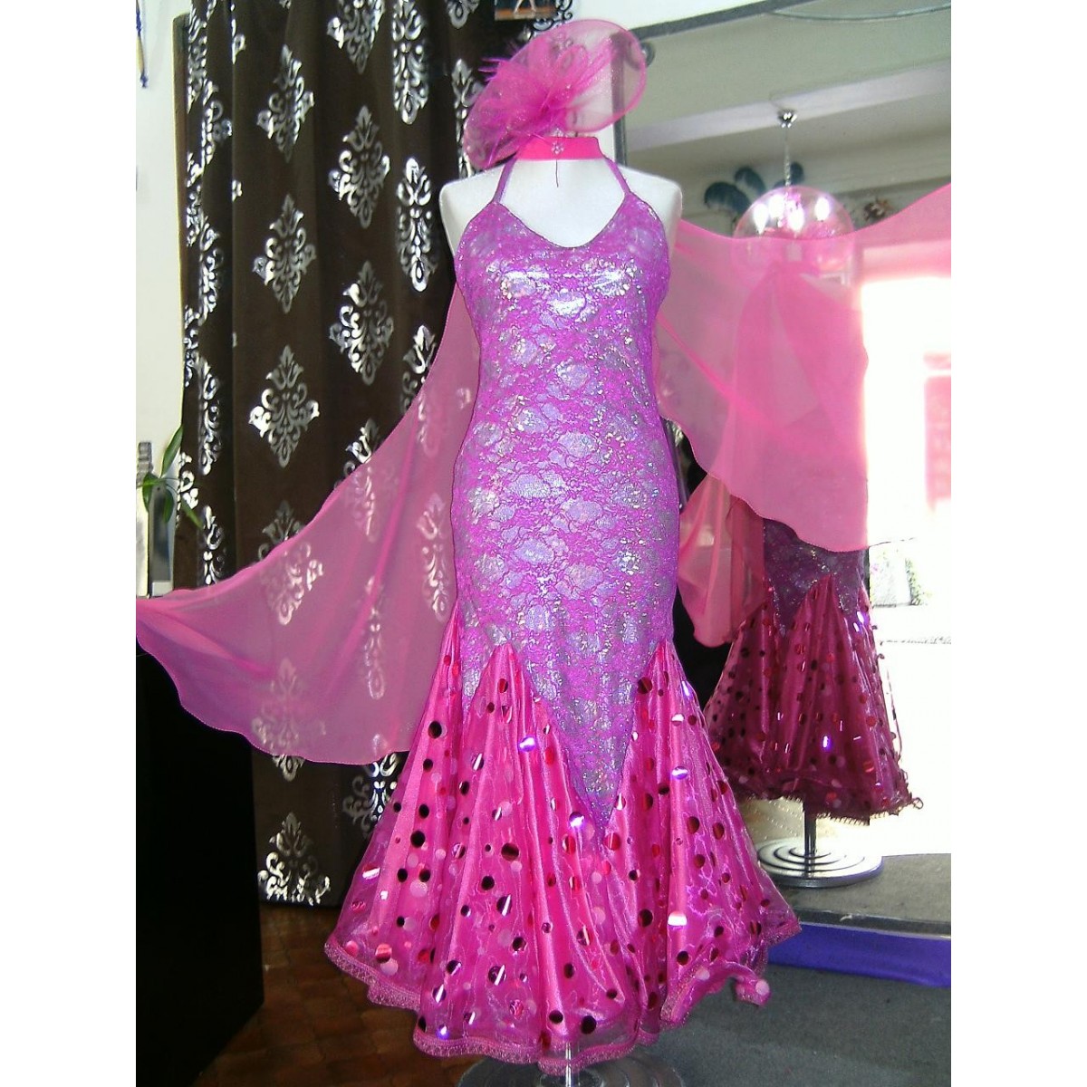 Elegant dress for standard dances made of lycra doubled diamond lace fuchsia.