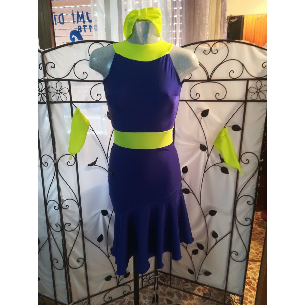 The asymmetrical cut dress boosts the figure and facilitates the dance steps.