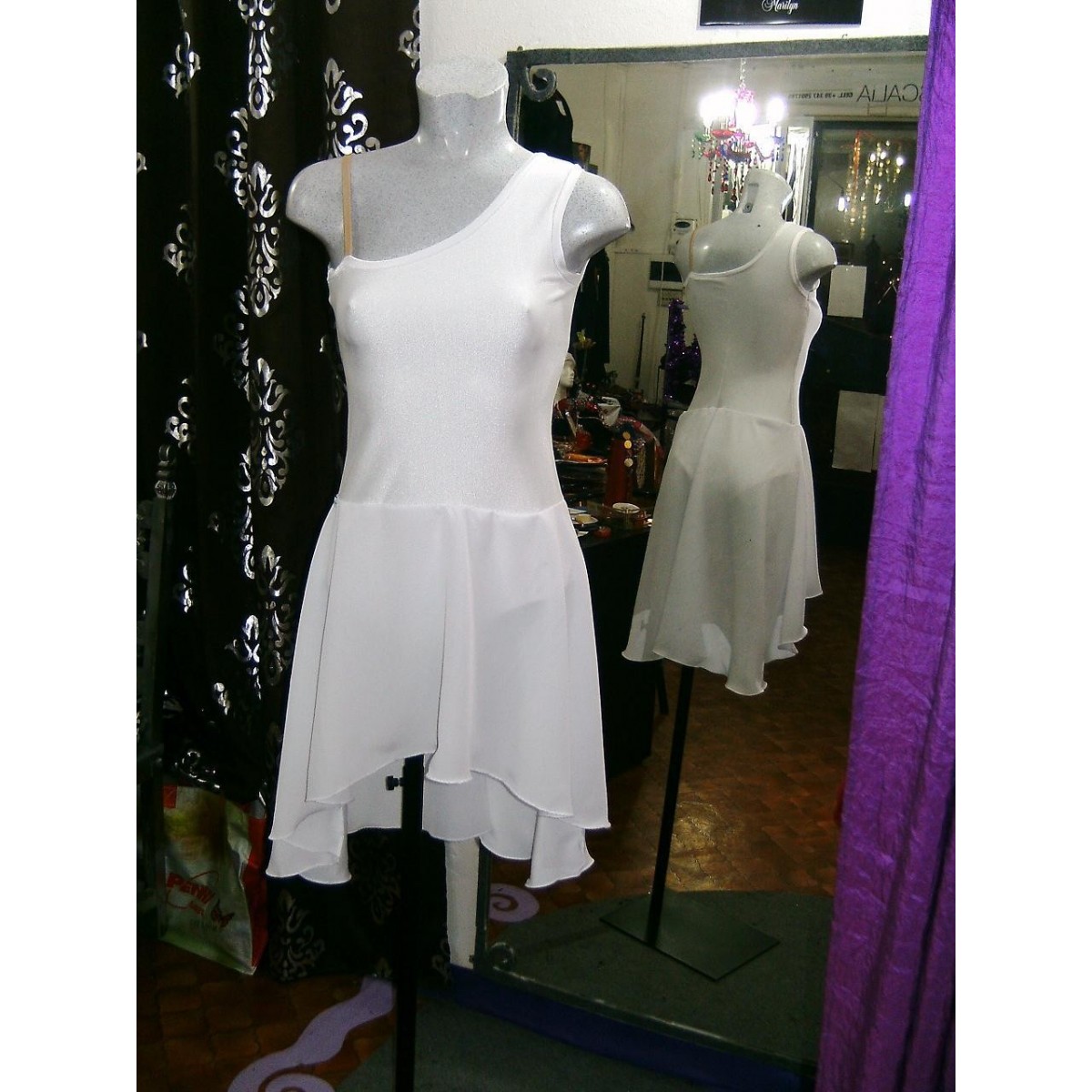 The model has shoulder spallino flesh-colored, the soft skirt is flared and is longer at the back to form a a corolla.