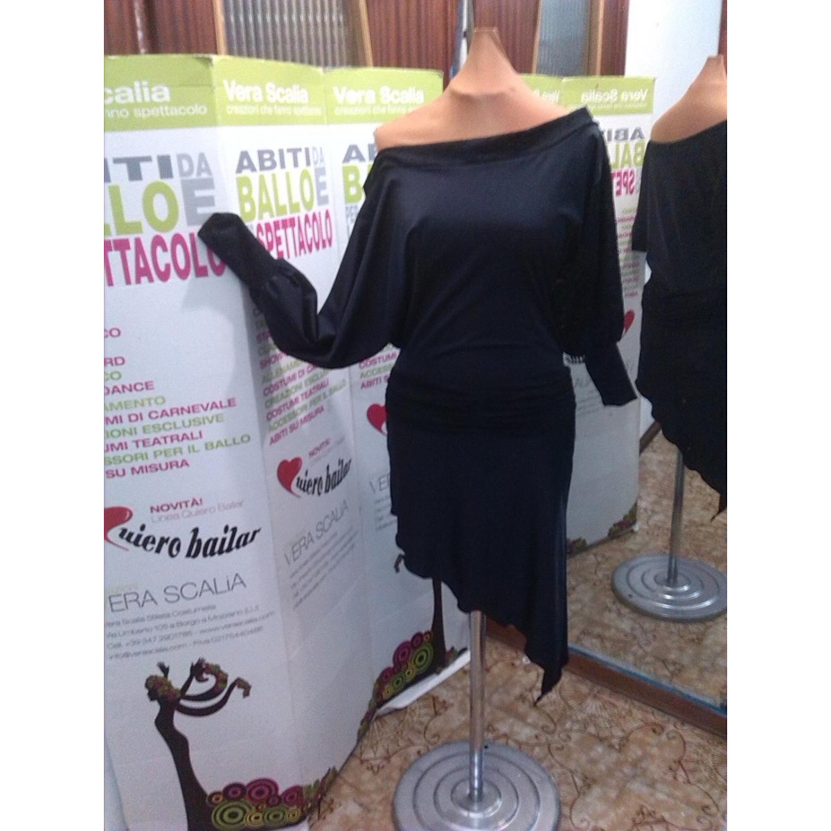 Linea affusolata per la gonna asimmetrica con punta laterale, il corpino ha maniche a pipistrello alternate da polsino in pizzo su manica in lycra e polsino in lycra su manica pizzo.