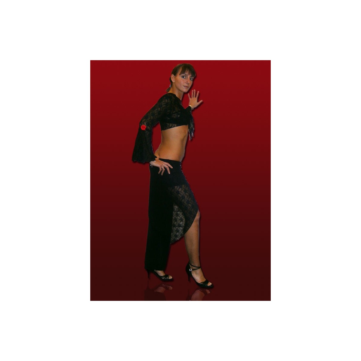 Il pantagonna , dal disegno esclusivo, avvolge la gamba destra cn la trasparenza del pizzo; la gamba sinistra è coperta dal mezzo pantalone con spacco.