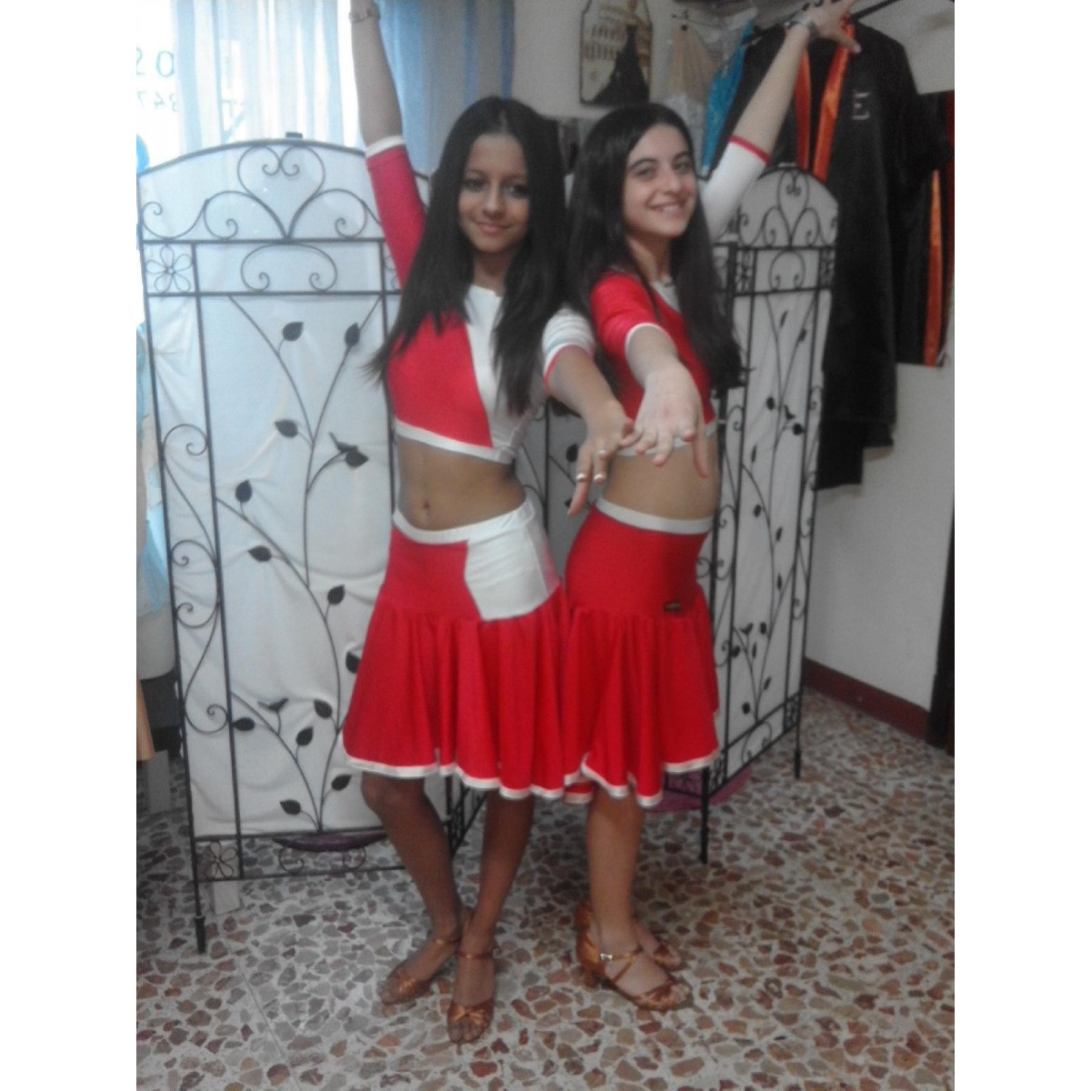 Corpino e gonna hanno linea asimmetrica curvilinea che evidenzia lo stacco dei colori.