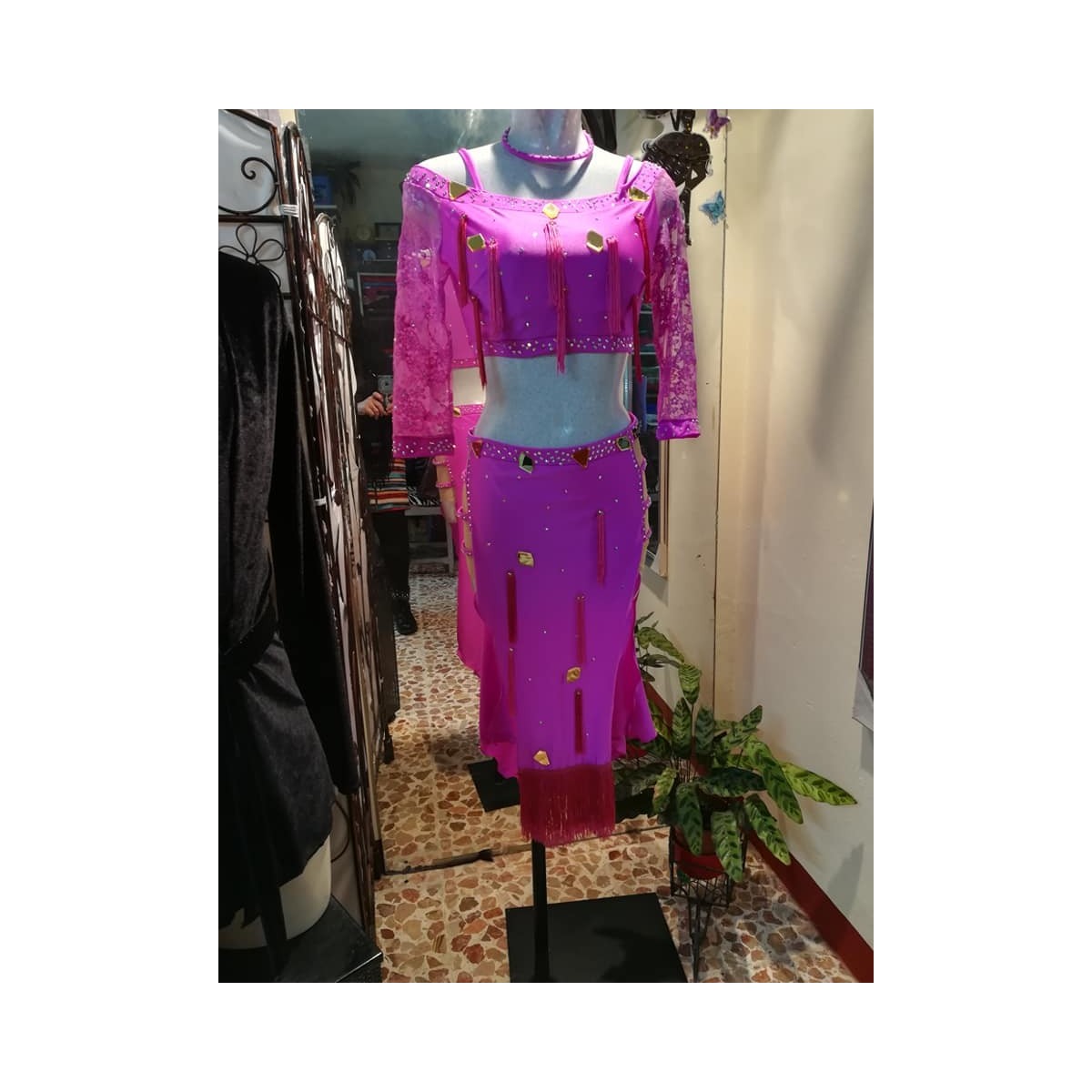 Il corpino ha scollo a barca ampio,le maniche di pizzo ed è rifinito da fili di frange,strass e specchi.