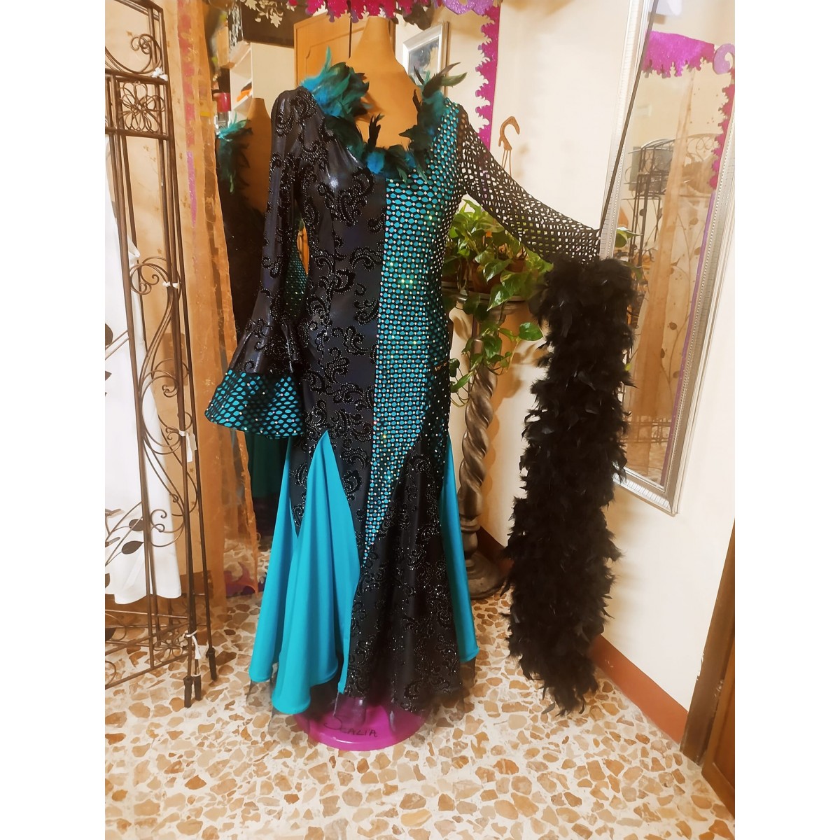 Interamente ricoperta di strass aurora boreale la parte in rete attrae l'attenzione sul lato sinistro della dama che rimane più in vista ai giurati, mentre la parte in lycra barocca brillantinata illumina la parte destra.