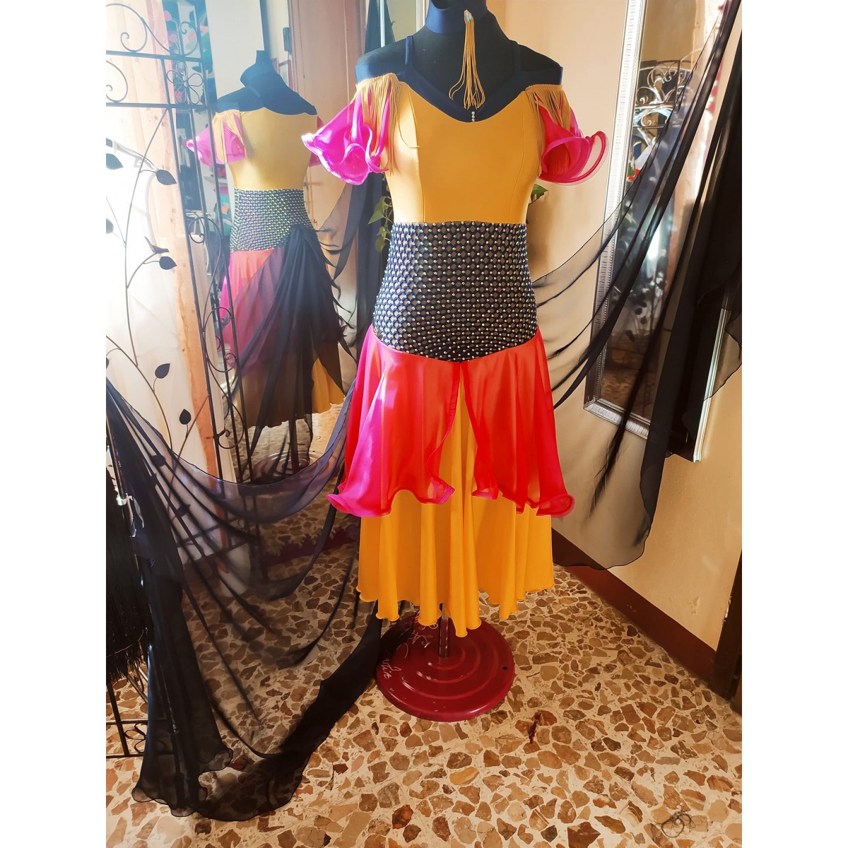 L'abito presenta gonna a ruota con sovragonne rifinite con crine.