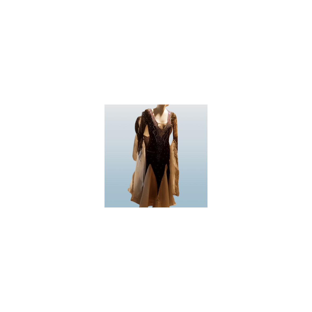 L'abito ha scollo profondo sia sul davanti che sul dietro ed è ricoperto di strass su tutto il corpino e sulle maniche.
